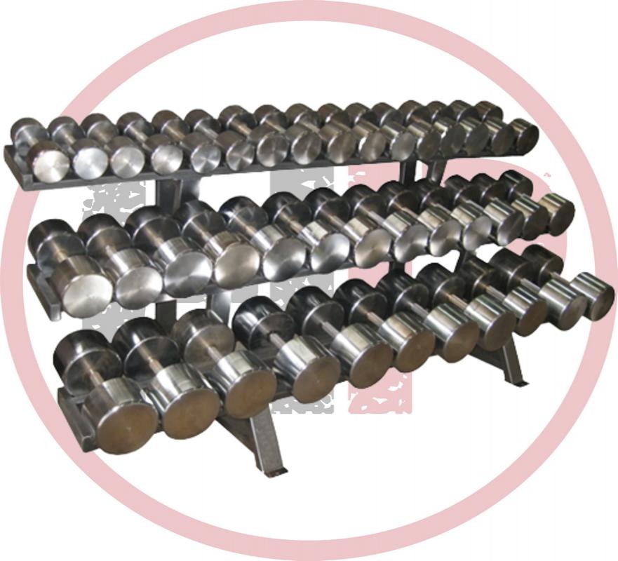 Гантели стальные с комплексным покрытием из никеля и хрома. Основное преимущество стальных хромированных гантелей - их компактность при внушительном весе, из-за высокой плотности стали. Поверхность гантелей шлифована, края закруглены, что делает упражнения комфортными и безопасными; а рукоятки с глубоким рифлением исключают всякое скольжение гантелей в руке. Хромовое покрытие придает шикарный блеск гантелям и эффектный внешний вид всему комплекту. Гантели размещены на трёхрядном стеллаже.