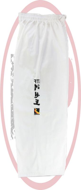 Изготовлен добок для тхэквондо ITF из смешанной ткани, поликоттон, плотностью 200 г/м². Униформа из такой ткани легко стирается и гладится, дает меньшую усадку после стирки, лучше держит форму и имеет более аккуратный "белый" вид. "White Belt" — униформа тех, кто еще не достиг черного пояса. Куртка на липучке без черных элементов униформы мастеров: окантовка, лампасы и т.д. Все изображения и надписи нанесены вышивкой, что обеспечивает хороший внешний вид и долговечность. Просторные длинные брюки на поясе удерживаются широкой резинкой и вставным шнуром. Особенность составных брюк заключена в специальной вставке, шириной несколько сантиметров, которая начинается в паху и идет до самого низа штанины, замещая внутренний шов.
