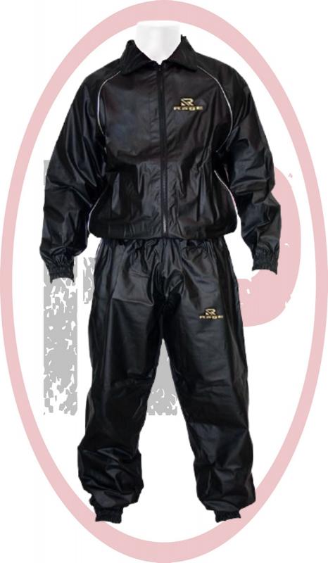 Костюм для сгонки веса Rage сделан из высокопрочного нейлона, что позволяет не только бегать, но и выполнять аэробные и акробатические движения. Костюм - сауна имеет надежные и плотно прилегающие манжеты, обеспечивают полноценный эффект сауны.   Удобная куртка на молнии. Все швы на костюме проклеены и имеют двойную прошивку. Костюм имеет удобный капюшон Цвет: черный. Размер: S, M, L, XL, XXL. Рекомендация: костюм - сауну необходимо подбирать так, чтобы он сидел свободно и не обтягивал. Не рекомендуется заниматься в костюме без перерыва более 1 часа.