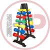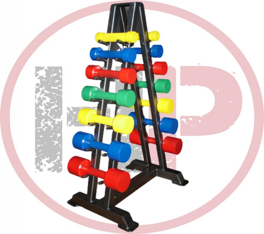 Гантельный ряд состоит из семи пар цветных гантелей с полимерным покрытием, и Л-образного стеллажа.