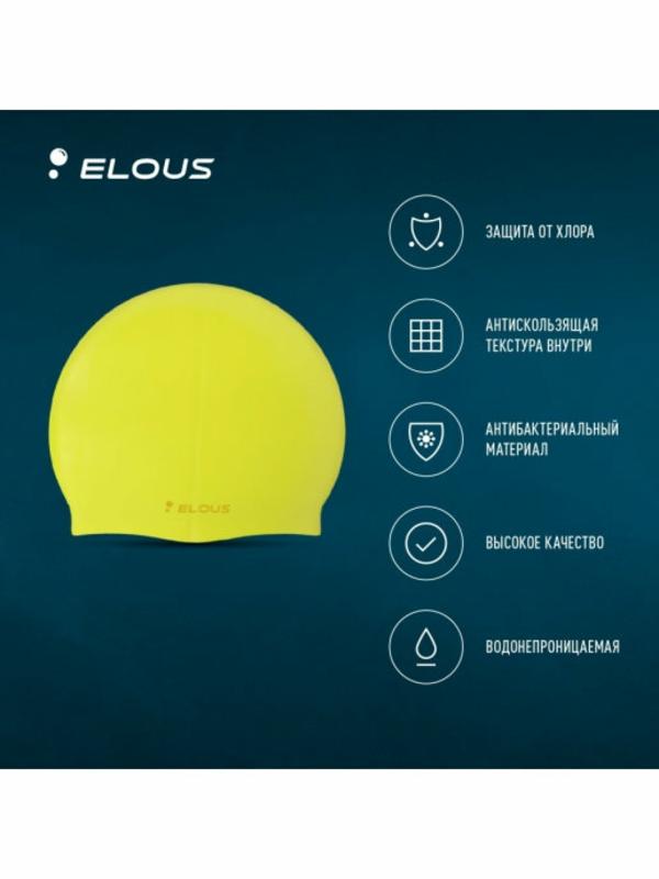 Силиконовая шапочка Elous - изготовлена из высококачественного силикона устойчивого к воздействию хлорированной воды, сохраняет цвет, форму и высокую эластичность на протяжении всего срока службы. Силиконовая шапочка Elous надежно защищает волосы и кожу головы от воздействия хлорированной воды в бассейне, обеспечивает безопасность во время плавания, защищая от попадания волос в глаза и в бассейн. Материал шапочки не вызывает раздражения кожи и других аллергических реакций. Покрыта тальком. Дополнительное прилегание и надежность фиксации на голове благодаря специальному рельефному рисунку на внутренней стороне шапочки. Прекрасно подходит для регулярных тренировок в бассейне. Шапочка упакована в прозрачный брендированный пакет.