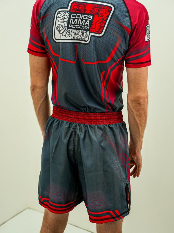 Фиксация на поясе осуществляется с помощью широкой застежки-липучки в сочетании с внутренним шнурком, что гарантирует плотную посадку и исключает смещение шорт в процессе тренировок или боя. Дизайн изделия выполнен в корпоративных цветах Союза ММА, с нанесением яркой и стойкой сублимационной печати, которая не выцветает даже после многократных стирок.