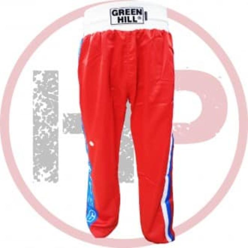 Брюки Green Hill из атласного полиэстра используются для кикбоксинга. Широкая резинка в поясе + шнурок. Не сковывают движений. Конструкция брюк позволяет наносить удары ногами без каких-либо неудобств. В таких брюках разрешено выступать на соревнованиях. Цвет брюк определяется углом, в котором выступает спортсмен.