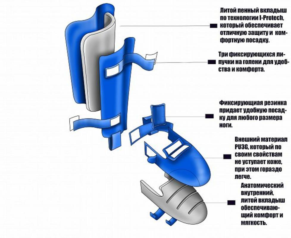В основу защиты входит внутренний материал литой пенный вкладыш, который не теряет форму и обеспечивает комфортную посадку по ноге спортсмена, стопа отсоединяется от голени и при желании можно поменять. Удобная фиксация на липучках. Стопа усилена в области большого пальца.
